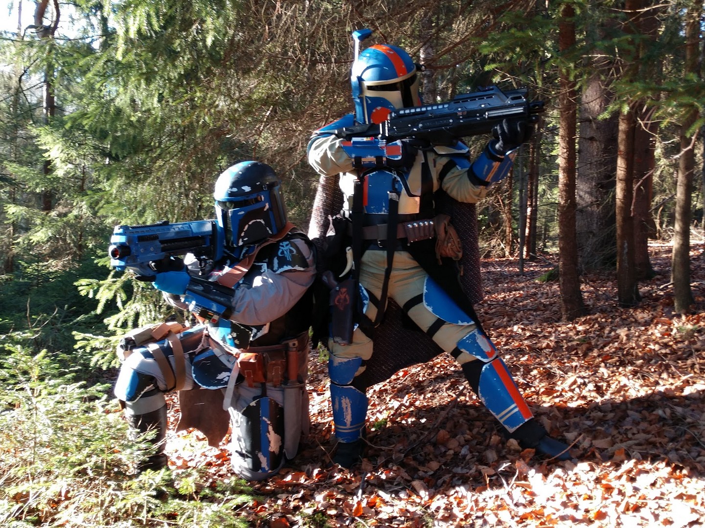 Komplette lackierte mandalorianische Rüstung aus 3D Druck und Hartschaumplatten (mit oder ohne Metallsandwitch Bauweise), incl Weste, Overall, Handschuhen mit Handschutz und Helm mit optischem Visier(OPLE) und Lüftern, (optional mit LED Akkzenten)