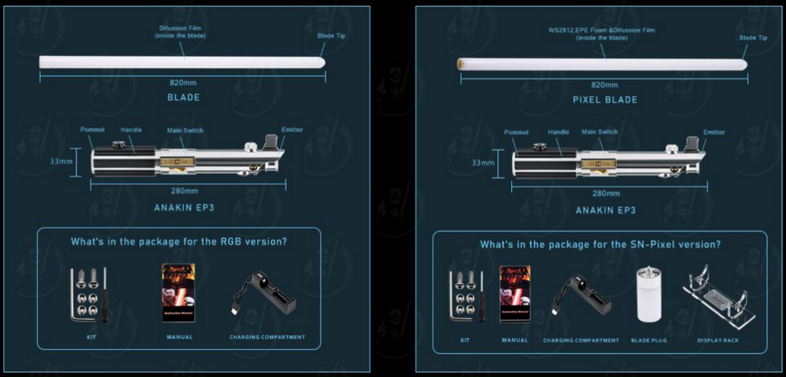 Ein hochwertiger Basicsaber aus dem Hause von TXQ mit nur 4 Soundfonts. Simple Einknopfbedienung, verdeckte Ladebuchse und ein einfacher Griff zeichnet diesen Saber aus, weshalb es besonders günstig ist. Wer also etwas sucht, für den regelmäßigen Zweikampf, ist mit diesem Saber bestens versorgt.